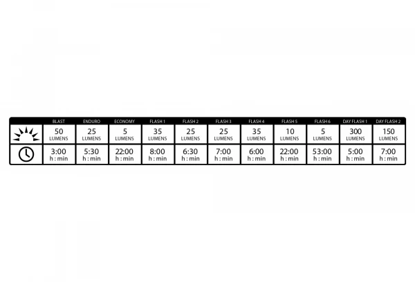 - 11 modes : Blast, Enduro, Economy, Flash 1, Flash 2, Flash 3, Flash 4, Flash 5, Flash 6, Day Flash 1, Day Flash 2.