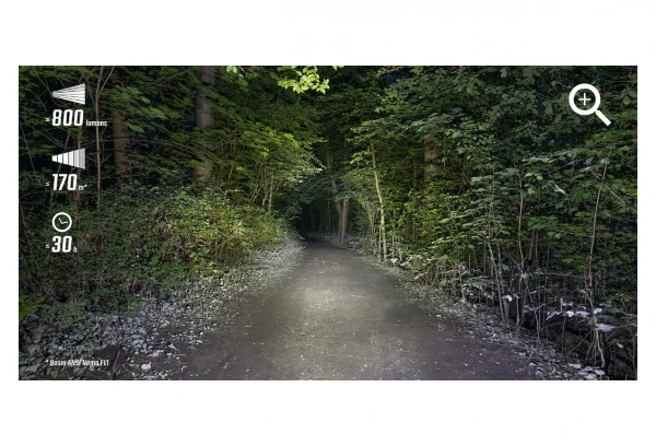 - 5 modes d’eÌclairage : High (800 lm) ; Mid (400 lm) ; Low (150 lm) ; Night flashing (600/200 lm) ; Day flashing (200 lm)