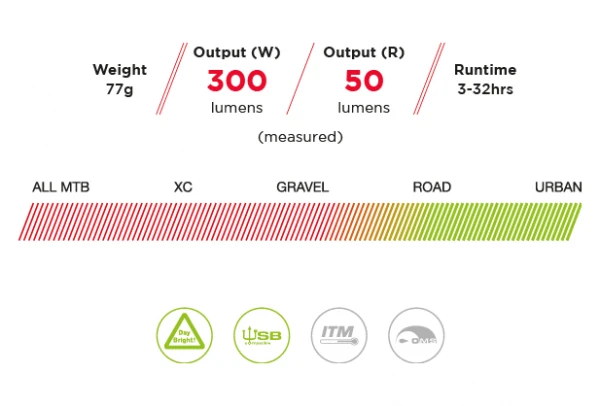 - Puissance maximale : 300 Lumens (avant) / 50 Lumens (arriĂšre)
