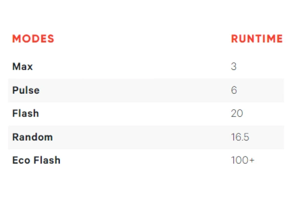 - 5 modes d’Ă©clairages (Max, Pulse, Flash, Random, Eco Flash)