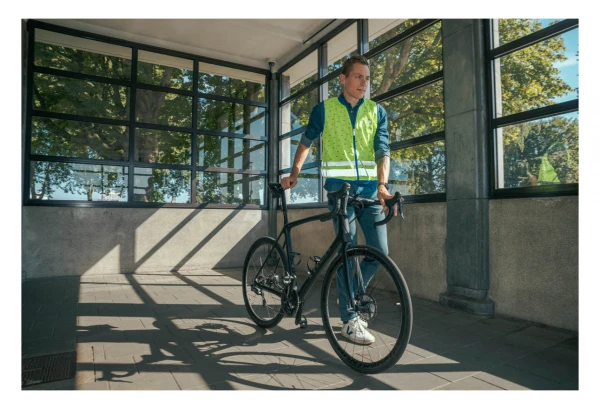 - Tissu Ă cĂŽtes contrastĂ© au niveau du col et de lâourlet + bandes rĂ©flĂ©chissantes horizontales (certificat EN1150).