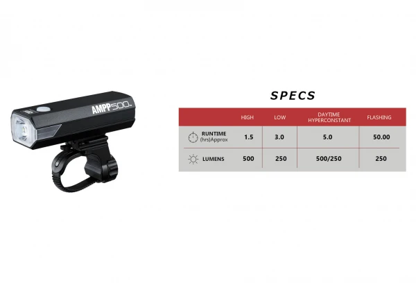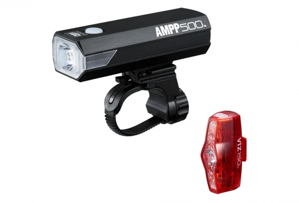 La paire d’Ă©clairages Cateye AMPP500 & ViZ150 est composĂ©e de l’Ă©clairage avant Cateye AMPP500 et de l’Ă©clairage arrière Cateye ViZ150.