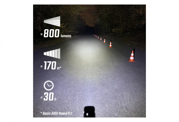 - 5 modes dâeÌclairage : High (800 lm) ; Mid (400 lm) ; Low (150 lm) ; Night flashing (600/200 lm) ; Day flashing (200 lm)